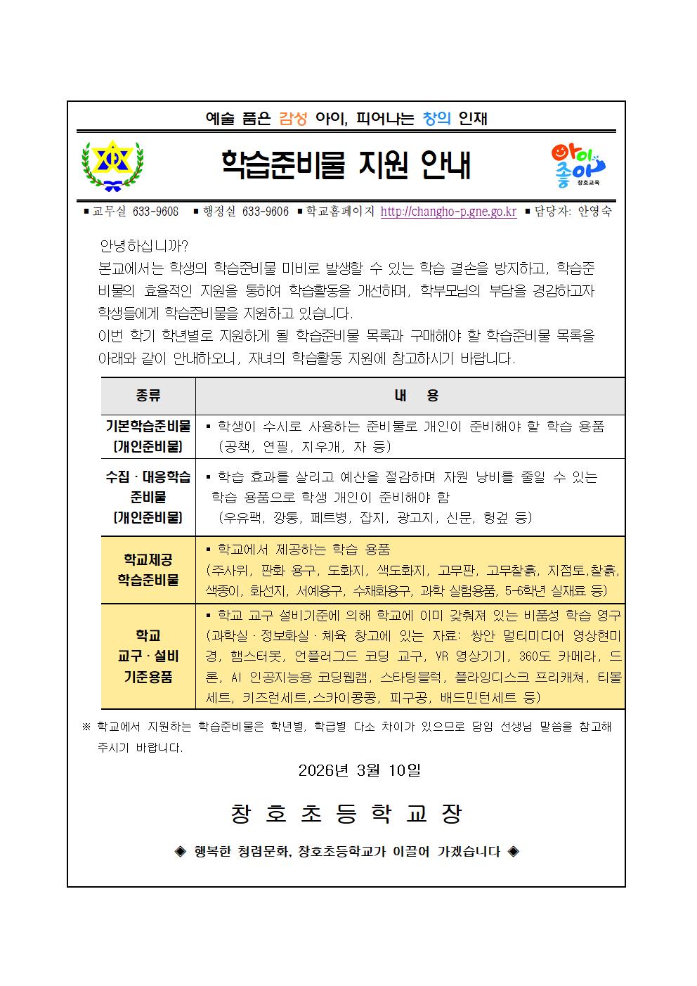 2026학년도 학습준비물 지원 안내