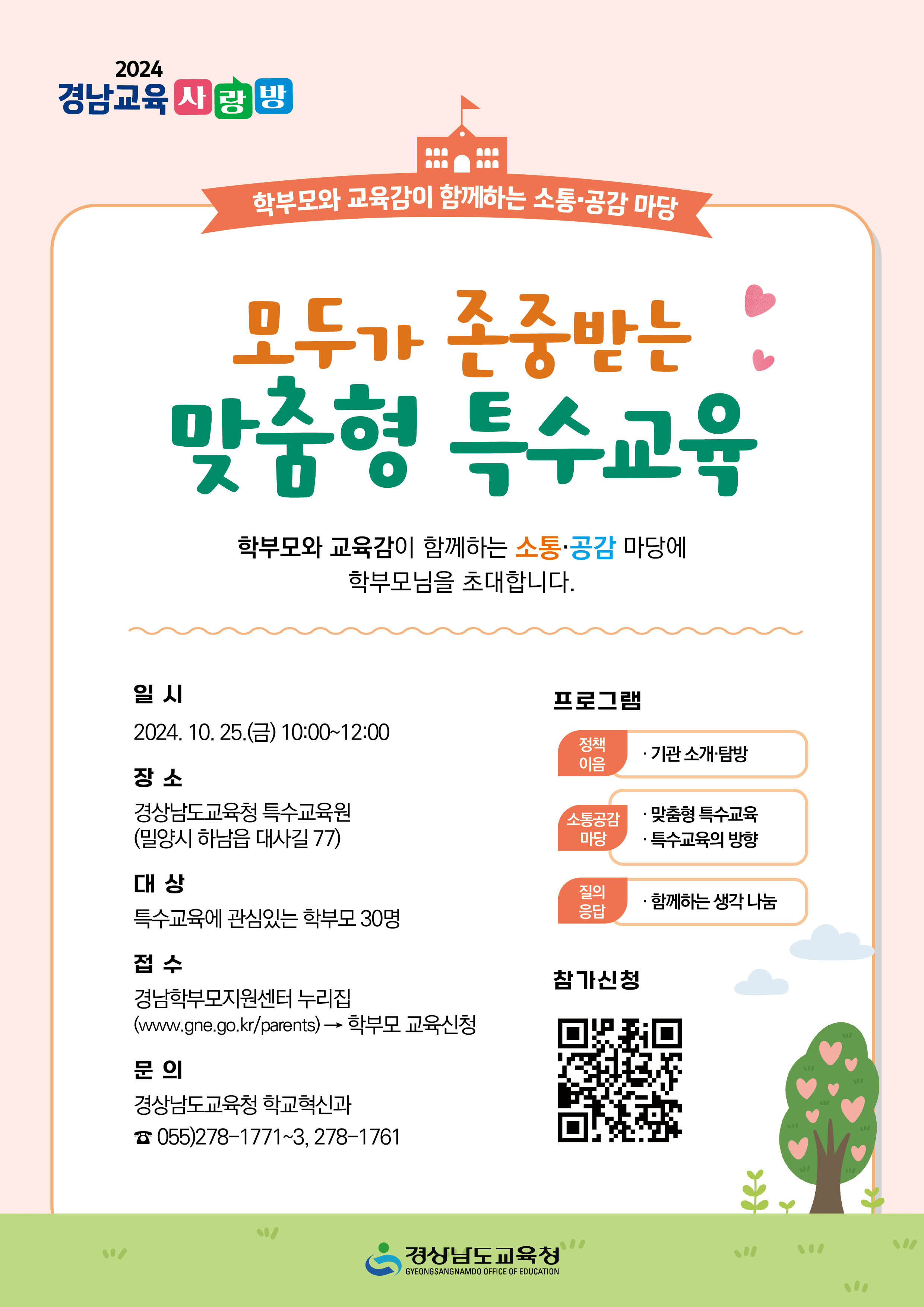 가. 주제: 모두가 존중받는 맞춤형 특수교육 나. 대상: 특수학교 학부모회 임원, 희망 학부모 다. 일시: 2024. 10. 25.(금) 10:00 ~ 12:00 라. 장소: 경상남도교육청 특수교육원(밀양시 하남읍 대사길 77) 마. 참여 신청 방법: 온라인 개별 신청 - 신청주소: http://url.kr/jubz16 (경남학부모지원센터 누리집-학부모 배움터-학부모 교육신청) - 신청기간: 2024.10.10.(목) ~ 10.18.(금) - 모집인원: 학부모 30여명