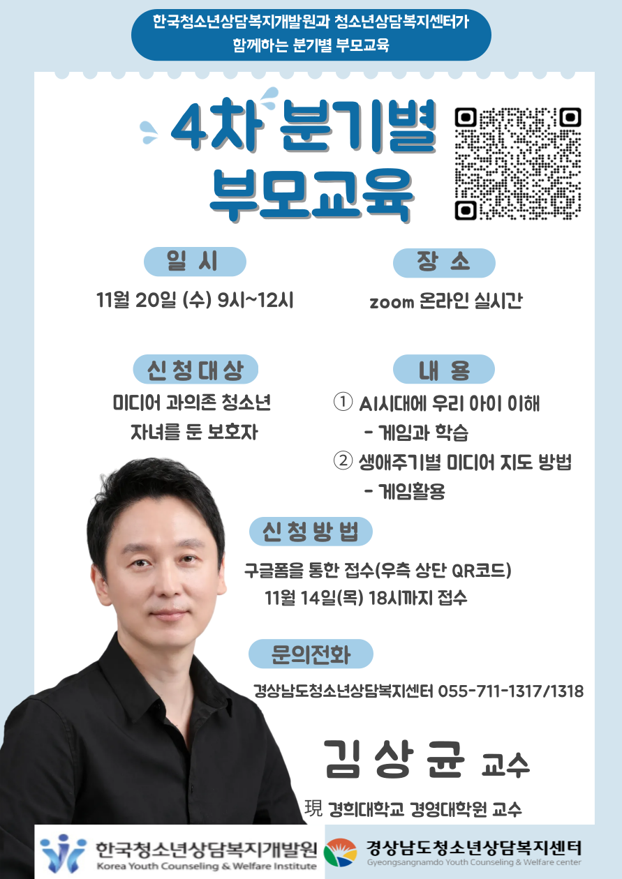 - ID : 881 1184 7237 - PW : 3193 - 링크 : https://us06web.zoom.us/j/88111847237?pwd=tgrp8wnQUKGPbwTWaU0bO7u3TLQC1E.1 6. 협력 : 경상남도교육청 7. 세부일정 일시 | 내용 | 강사 | 9:00~9:30 | 입장 및 출석 확인 | 지역별 담당자 | 9:30~10:25 | AI시대에 우리 아이 이해 ? 게임과 학습 | 김상균 교수 | 10:25~10:30 | 쉬는시간 | - | 10:30~12:00 | 생애주기별 미디어 지도 방법 - 게임활용 | 김상균 교수 | 8. 모집기간 및 접수방법 - 모집기간 : 11.14.(목) 18:00까지 - 접수방법 : 구글폼을 통해 접수 ☞ https://forms.gle/qjciH3ht4BPgLpjs8 QR코드 스캔  - 문의 : 경상남도청소년상담복지센터 055-711-1317